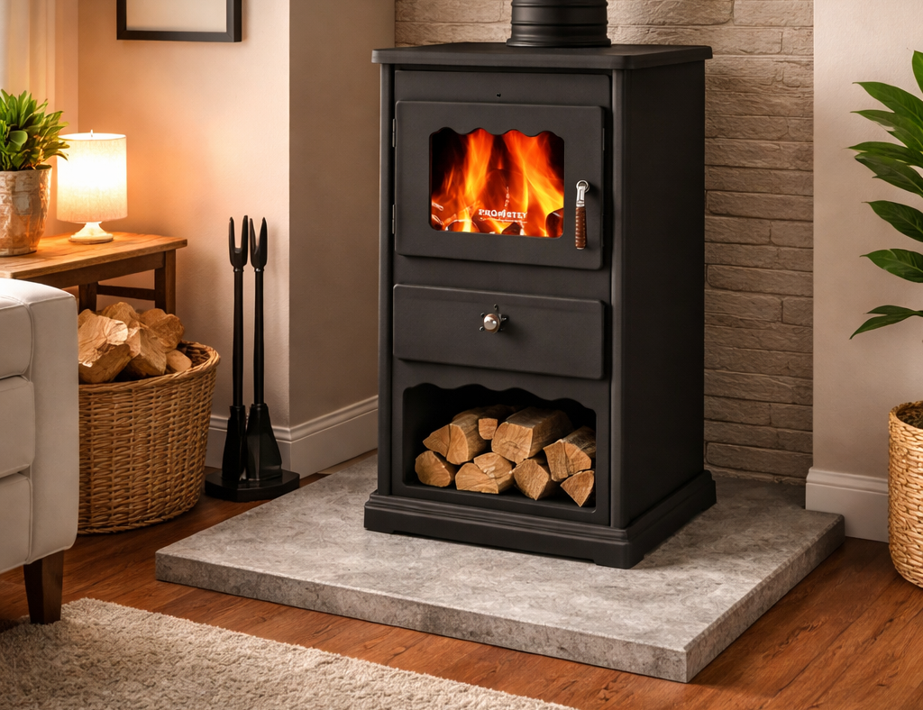 Камини на дърва Prometey „Метален плот 2“ с метален плот и модерна визия.