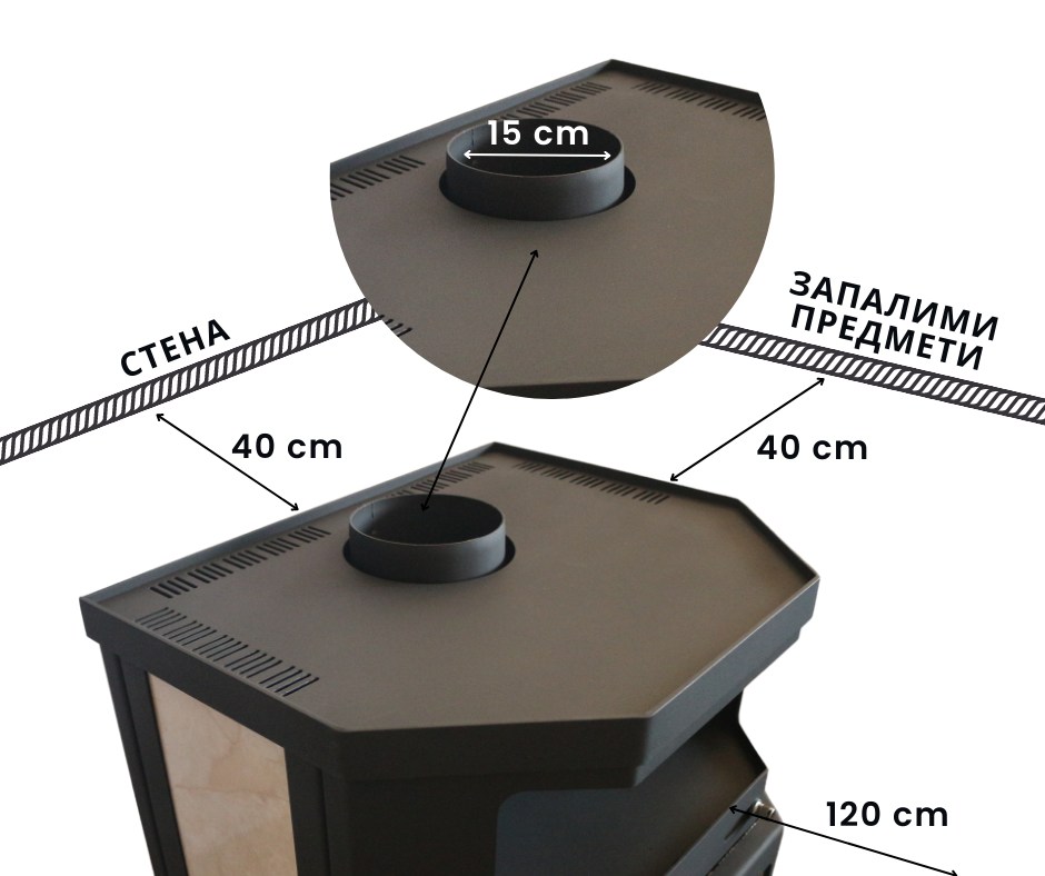 - Горивната камера е оборудвана с термошокова стъклокерамика, издържаща на температури до 850°C.