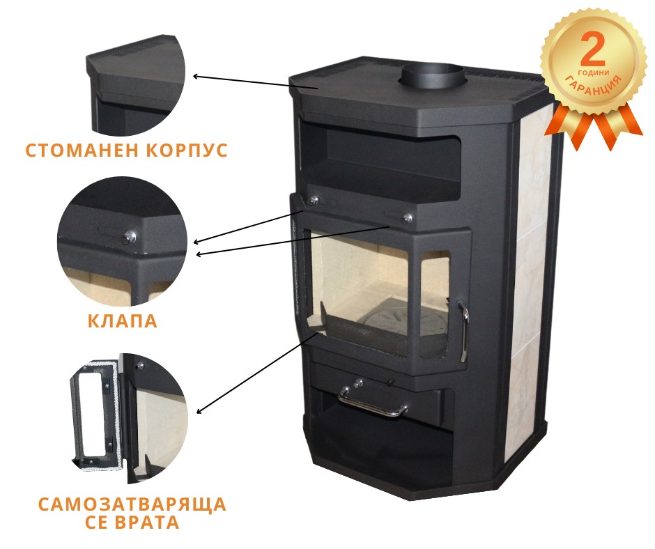 - Горивна камера подсилена с огнеупорни тухли, които акумулират топлина и увеличават температурата на горене.