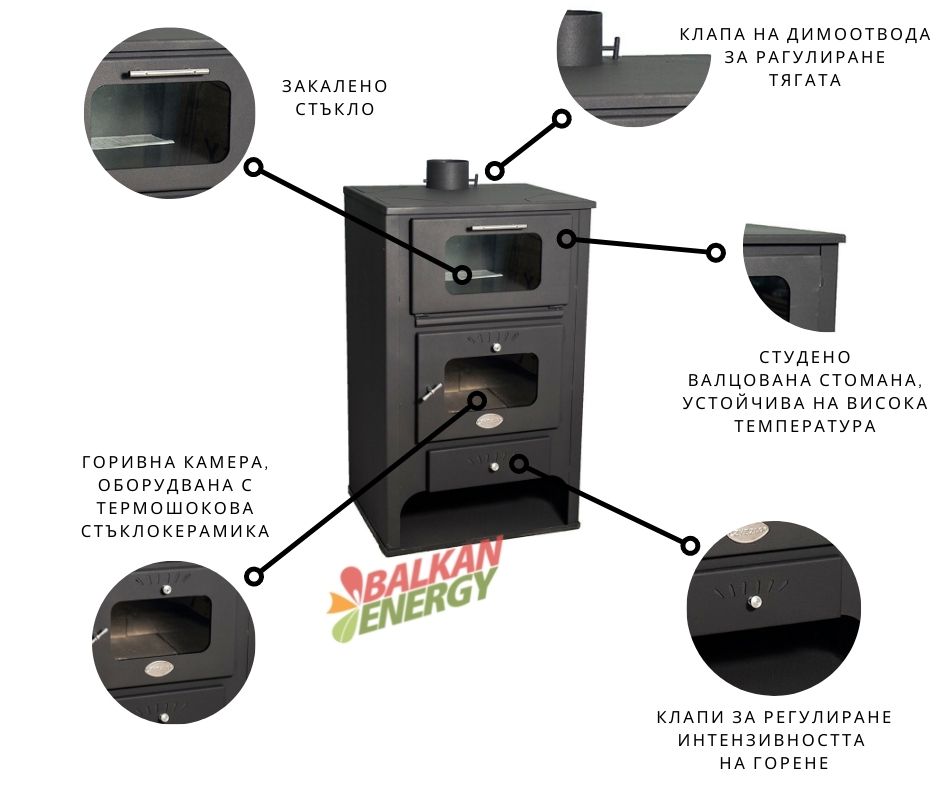 - Горивната камера е оборудвана с термошокова стъклокерамика, издържаща на температури до 850°C.