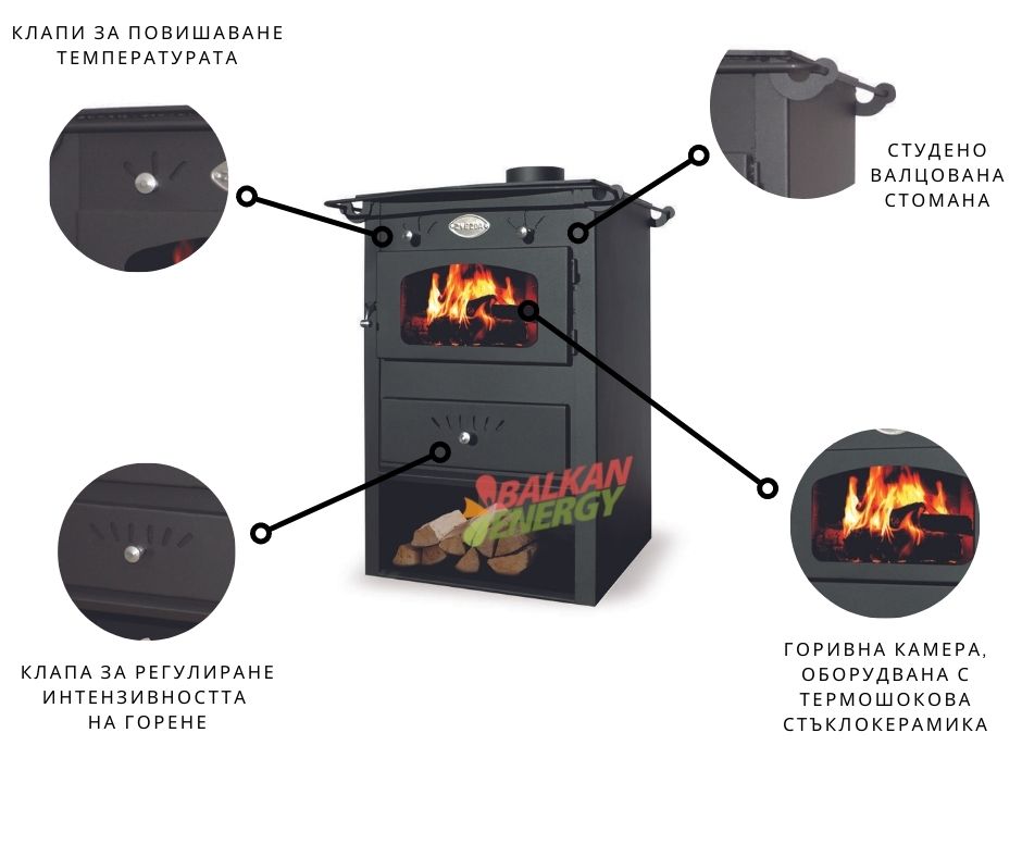 - Горивната камера е оборудвана с термошокова стъклокерамика, издържаща на температури до 850°C.